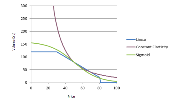 A graph showing the three commonly used Market Response Model forms.